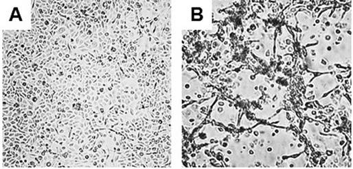 Figura 5 Cultivo de queratinocitos sobre una membrana acelular derivada de vejiga porcina. Se muestran las células cultivadas en ausencia de fibroblastos (A) y en cultivo organotípico (B). En este último, los fibroblastos se cultivaron sobre el lado opuesto de la membrana 15 días antes de agregar los queratinocitos.