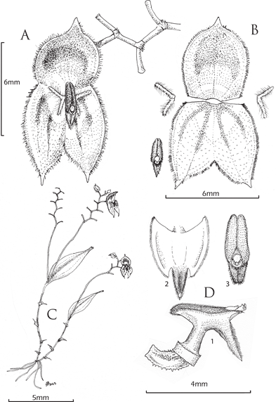 Figure 1 Illustration of Lepanthes mashpica Baquero & T.S.Jaram. A. Flower. B. Dissected perianth. C. Habit. D. Column and lip. D1. Ovary, column and lip, side view. D2. Lip in expanded position. D3. Lip in normal position. Drawn by Luis E. Baquero from the plant that served as the holotype.