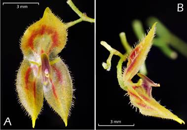 Other species of Lepanthes have a long process in the body of the lip like L. acrogenia Luer & R.Escobar, L. ectopa Luer, L. hirsutula Luer & Hirtz, L. skeleton Luer & R.Escobar, and L. thoracica Luer & Hirtz, but L. mashpica can easily be distinguished from them by the bigger and yellow flowers with conspicuously spiculated flowers in the margins and in the adaxial side of the sepals with tiny filiform, bilobed petals (Luer 1996, Luer & Thoerle 2011, 2012) (Fig. 3-4).