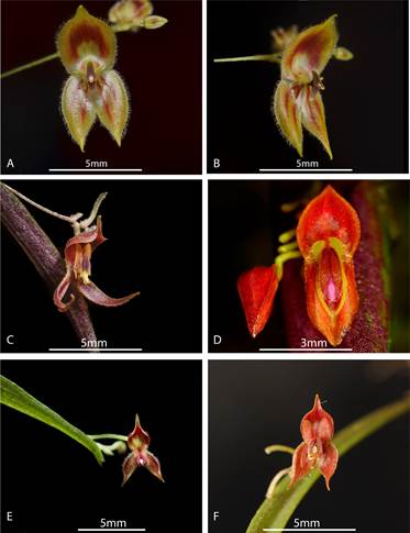 Figure 4 Comparison of the most similar species to Lepanthes mashpica Baquero & T.S.Jaram. A. Lepanthes mashpica (frontal view). B. Lepanthes mashpica (– view). C. Lepanthes acrogenia, D. Lepanthes satyrica, E. Lepanthes hirsutula, F. Lepanthes thoracica. Photographs by Luis E. Baquero (A, B and F), Sebastian Moreno (C and E), and Andreas Kay (D).
