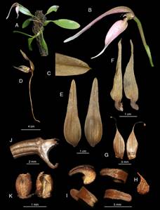 Figure 1 Bulbophyllum leysianum Burb. A. Flowering plant. B. Flower, side view. C. Leaf apex. D. Flower with pedicel and peduncle. E. Dorsal sepal. F. Lateral sepals. G. Petals. H. Warty apex of petal. I. Labellum, different views. J. Column. K. Anther cap. (Truong B.V., BV 340, Hon Ba, Khanh Hoa province, Vietnam).
