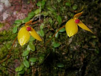 Small, creeping, epiphyte on branches orchid. Rhizomes ca. 0.5 mm in diameter. Pseudobulbs 1-leafed, ovoid, narrowly elliptic, ca. 6 mm long. Leaves 1-leafed, elliptic ca. 9.5 mm long, 5 mm wide, obtuse, petiole ca. 1.5 mm long. Inflorescence orange color, from base of mature pseudobulbs, 1-flowered, ca. 1.5 cm long, usually from pseudobulbs without leaves, floral bract, tubular, ca. 1 mm long. Flower open widely, tepals orange, labellum red, column red. Dorsal sepals elliptic, ca. 3 mm long, 2 mm wide, subacute and minutely apiculate, margins entire, glabrous, 5-veined. Lateral sepals elliptic, ca. 4.5 cm long, 2.5 cm, rounded, margins entire, glabrous, 5-veined. Petals elliptic, ca. 1.5 mm long, 0.5-0.6 mm wide, obtuse, margins entire, glabrous, 1-veined. Labellum simple, attached to the column foot by white ligament, recurved proximally, elliptic, ca. 2.1 mm long, 1.2 mm wide, margin distally folded downward, abaxial surface concave and glabrous proximally, convex and coarsely verruculose distally. Column ca. 0.3 cm long, column foot ca. 1 mm long, stigma elliptic; stelidia ca. 0.8 mm long, triangular subulate, slightly downwards curved, acute. Pollina 4. Anther cap not seen.