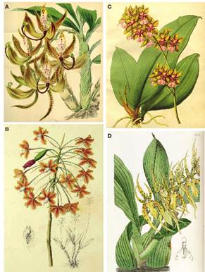 Figure 7 A, Cycnoches loddigesii, from Hooker (1846). B, Schomburgkia marginata Lindl., from Lindley (1838). C, Oncidium lanceanum Lindl.from Lindley (1842). D, Brassia lanceana Lindl., from Lindley (1836).