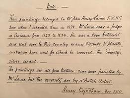 These paintings belonged to Mr. John Henry Lance F.R.H.S. from whom I inherited them in 1878. Mr. Lance was a judge in Surinam from 1823 to 1834. He was a keen botanist and sent over to this country many orchids & plants unknown here and for which he received the Society’s Silver Medal. The paintings were all from Nature: some were painted by Mr. Lance but the majority are by a Dutch Artist.