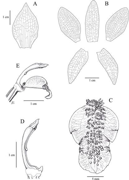 Figure 11 Chloraea septentrionalis. A. Floral bract. B. Dissected perianth. C. Lip. D. Column. E. Column and lip lateral view.