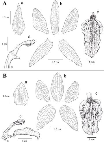 Figure 4 Chloraea pavonii Lindl. A. Flower of a plant from Arahuay-Lachaqui, Canta (G. Vilcapoma 2212, USM-278407). B. Flower of a plant from Bosque de Zárate, Huarochirí (E. Morón s.n., USM-257683). a. Floral bract. b. Dissected perianth. c. Lip. d. Column. e. Column and lip lateral view.