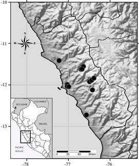 Known only from central western slopes of Peru. It has been recorded in five provinces of the department of Lima: Huaral, Canta, Huarochirí, Lima and Cañete, between 350 and 3100 m of elevation (Fig. 5).