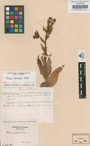 Original collection by H. Ruiz and J. Pavón, hosted at the Herbario del Real Jardín Botánico (MA-01-00810745). Retrieved from the web page of Real Jardín Botánico, filed as Chloraea peruviana. URL: http://colecciones.rjb.csic.es/#card.php?id_name=22431/ Retrieved: 13 Apr 2020. All the rights belong to the Real Jardín Botánico-CSIC.