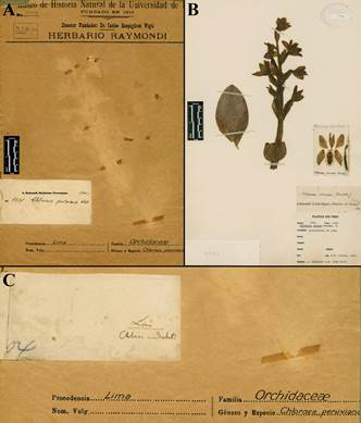 Figure 9 Lectotype of Chloraea undulata (=Chloraea pavonii). A. Raimondi Herbarium Sheet Number 9904 at USM, original herbarium sheet from where the specimen was removed. B. Herbarium specimen removed from the Raimondi Herbarium Sheet Number 9904 and mounted in a new sheet with a new label. C. Original label (the second one) with the Raimondi’s handwriting glued on the Raimondi Herbarium Sheet Number 9904.