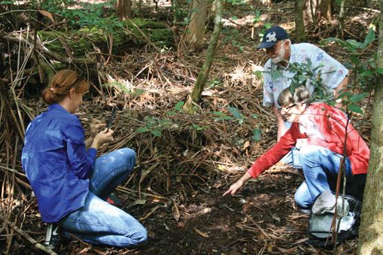Figure 2 Habitat and original place of discovery of Rhizanthella speciosa with its discoverer Maree Elliot pointing to the location of one flowering head, accompanied by Sky Moore and Bill Dowling.