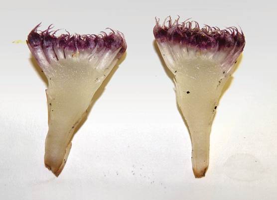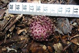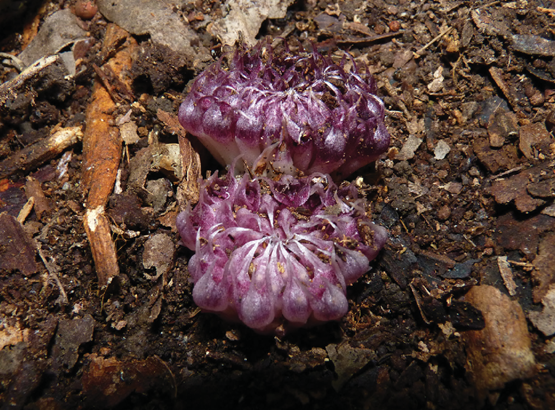 When viewed uncovered in the wild, Rhizanthella speciosa is the most striking species found so far in the genus. The flowering head, which ranges from bright mauve to pinkish-purple in bud and in flower, is clearly visible against the dark ground and leaf litter on the forest floor. The prominent elongate sepals, which are a notable feature of this new species, give flowering plants a similar appearance to that of a sea anemone. At anthesis the flowers open widely with the lateral sepals widely divergent. In this state many inflorescences emit a pungent odor not unlike native animal faeces or a fruiting fungus. Not all flowers of the new species set fruit which contrasts with the pollination biology of R. slateri where a very high proportion of flowers set fruit.