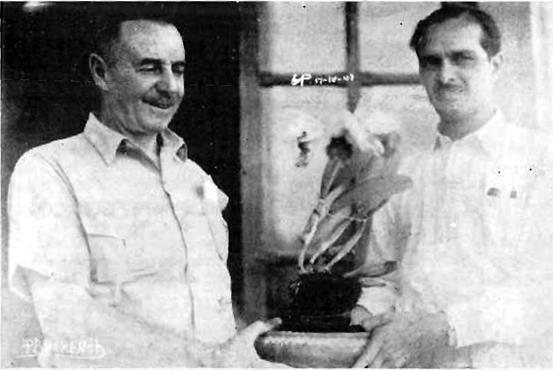 Lankester, C. H. (1945c). Cattleya dowiana (Guaria de Turrialba). Revista del Instituto de Defensa del Café de Costa Rica, 15(131), 538−541. (En este artículo Lankester brinda abundante información sobre esta especie de orquídea. Lankester y Claudio Escoto aparecen en una fotografía en la portada (reproducida aquí en la Fig. 2) con la siguiente leyenda: “Los caballeros don Carlos H. Lankester y Lic. don Claudio Escoto León asistieron en calidad de Designados de Costa Rica al Congreso de Orquideología de México, en el cual presentaron esta hermosa “Guaria de Turrialba”, que tuvieron después la oportunidad de obsequiar a la Primera Dama de la República azteca.”)