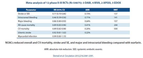 De forma global los resultados de los cuatro grandes en sayos clínicos llevados a cabo con anticoagulantes directos (ACODs: Dabigatran1, Rivaroxaban2, Apixaban3 y Edoxaban4) en pacientes con fibrilación auricular (FA) indican que en comparación con los antagonistas de la vitamina K, en con creto warfarina, dichos compuestos muestran una mayor eficacia en la prevención del ictus y una menor incidencia de sangrado grave, en particular su forma mas grave, la hemorragia intracerebral.