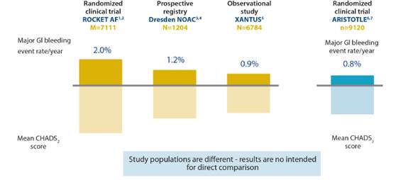 Como ya hemos comentado, los pacientes incluidos en ROCKET mostraban un perfil de riesgo embólico y hemo rrágico mayor que los aleatorizados en los demás grandes ensayos clínicos con ACODs, hecho que podría tener una cierta influencia en los resultados observados. Los registros del “mundo real” con Rivaroxaban (Xantus6, Dresden NOAC7, etc) parecen confirmar esta observación ya que en cohortes de pacientes con un perfil de riesgo similar el riesgo de sangrado gastrointestinal mayor fue significativamente menor al observado en el ensayo clínico y muy similar al descrito para Apixaban (0.9 y 0.8%/año, respectivamente). Por tanto, los registros del mundo real son de gran ayuda para una mejor definición de los grupos de pacientes en los que puedan optimizarse beneficios y riesgos en particular con las nuevas modalidades terapéuticas.