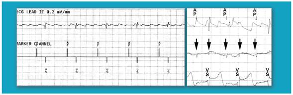 Fig. 1 Izquierda. Derivación II. Se observa patrón electrocardiográfico de flúter atrial, cuyo ciclo es aproximadamente 200 ms (unas 300 contracciones atriales por minuto) con conducción AV 4:1; debajo, el “canal de marcas” que indica los eventos detectados y estimulados por el marcapasos: en ese momento, AP-VS (estimulación atrial-detección ventricular). En el recuadro de la derecha, durante la telemetría, se observa la misma derivación de superficie y el indicador “AP” o estimulación atrial, el registro endocárdico atrial que muestra defecciones de alta frecuencia (flechas) y debajo, el registro endocárdico ventricular; VS indica detección ventricular.