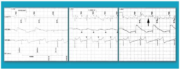 Cualquier ritmo atrial (sinusal u otro) que supere la fre cuencia programada de reposo en el marcapasos, debe inhibir la estimulación atrial; esta solo debe aparecer si el pa ciente se encuentra bradicárdico, por debajo de la frecuencia de estimulación programada en el marcapasos, usualmente 60 latidos por minuto. Una vez transcurrido el intervalo atrio ventricular (AV) programado, el marcapasos permite que se inscriba el complejo QRS propio del paciente; o bien, si este no aparece (como en los casos de bloqueo AV), envía el res pectivo estímulo ventricular. En esta paciente con disfunción sinusal, dado que tiene preservada su conducción atrioven tricular, el modo de estimulación en ese momento es AP-VS (Fig. 1), según la interrogación por telemetría; es decir, esti mulación atrial-detección ventricular; el flúter atrial (señala do con flechas) no inhibió la estimulación atrial, por lo que hay dos explicaciones: o el flúter no es detectado (una disfun ción del dispositivo)1, caso en el cual el marcapasos seguirá enviando sus estímulos a la frecuencia programada; o bien, no es flúter atrial.