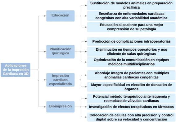La impresión cardiaca tridimensional ha demostrado tener múltiples aplicaciones que van desde educación hasta planificación quirúrgica e inclusive la ingeniería de tejidos. Con respecto al abordaje educativo que ofrece el uso de esta tecnología, se puede concluir la importancia de dicho avance para dejar de lado los métodos tradicionales que asocian el uso de modelos cadavéricos o animales para la preparación preclínica de los médicos, junto con las limitaciones éticas y culturales que se encuentran ligadas a estos. Adicionalmente, al considerar su aplicación al área quirúrgica, resulta en una disminución en los riesgos de mortalidad y dificultades operatorias. Así mismo, la impresión cardiaca en 3D de modelos personalizados ha mejorado de forma importante los resultados de cirugías complejas, la práctica preoperatoria y la orientación intraoperatoria principalmente en el caso de mal- formaciones congénitas. Finalmente, el campo de la bioimpresión es el más innovador y que podría llegar a alcanzar objetivos previamente inimaginables; este a pesar de estar apenas en sus etapas de prueba, ha mostrado un enorme potencial en el campo de la cardiología y la medicina en general.