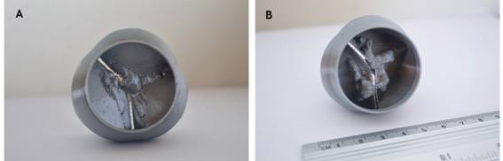 Figura 2 Impresión tridimensional de válvula aórtica bicúspide con fusión de comisura de valva coronaria izquierda con valva coronaria derecha y presencia de calcificaciones. (A.) Vista aórtica y (B.) vista ventricular.