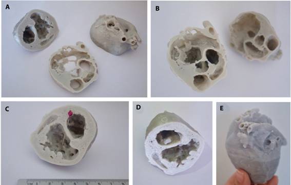 Figura 3 Modelo cardiaco de tres piezas impreso en 3D de una comunicación interventricular de tipo muscular. (A.) Piezas del corazón separadas. (B.) Dos tercios inferiores del corazón armado. (C.) Pieza inferior con la comunicación interventricular señalada con un alfiler. (D.) Pieza inferior con el defecto interventricular. (E.) Modelo cardiaco armado.