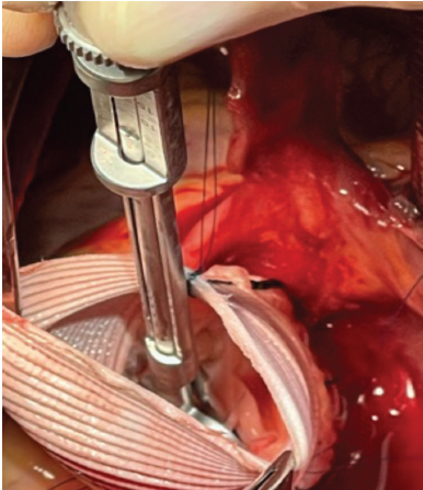 Después de la reimplantación de la válvula, es de suma importancia realizar una revisión de las valvas en busca de prolapso residual, simetría y la altura y profundidad de la coaptación. Esto es difícil de determinar mediante visualización directa al finalizar la reparación; afortunadamente, Schäfers et al. 16. introdujeron un calibrador para determinar la altura efectiva y verificar una adecuada coaptación de la válvula. Utilizamos este dispositivo en ambos pacientes y la medición se encontraba en el rango de efectividad (7-12 mm)17. (Figura 2)