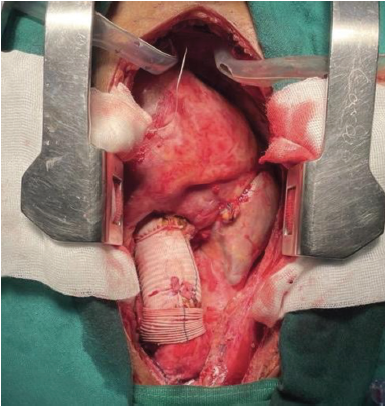 Figura 1 Fotografía de campo quirúrgico. Se observa la válvula aórtica reimplantada dentro del conducto de Dacrón.