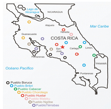 La población indígena de Costa Rica, integrada por ocho pueblos distribuidos en veinticuatro territorios (véase figura 1), con aproximadamente setenta mil personas, no cuenta con representación política en el Congreso; su esperanza estriba en la auto-organización de sus comunidades -su reinvención autopoiética (Maturana y Varela, 2004)-, la creación de sinergias a través de redes de información y apoyo y el recurso de mediación de entidades internacionales que velen efectivamente por sus derechos.