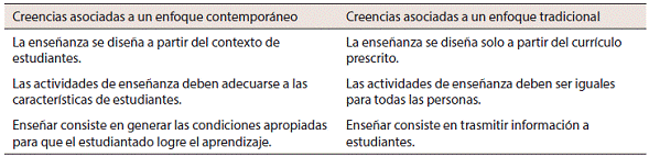 Diversos autores han consensuado el enfoque pedagógico como una forma de entender y actuar en la construcción de procesos de aprendizaje para el cambio. Estos enfoques caracterizan las creencias sobre la enseñanza-aprendizaje que subyacen a la práctica del profesorado (Costamagna, 2015; García, 2010). Asimismo, Vera y Meneses (2012) han planteado la adscripción del profesorado a perspectivas constructivistas en coexistencia con creencias de enfoque conductista. En otras palabras, las creencias docentes sobre el proceso de enseñanza aprendizaje aluden a sistemas tradicionales y contemporáneos.