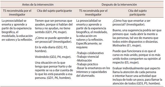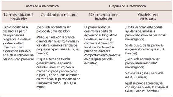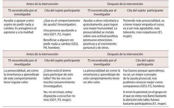 Los participantes logran enriquecer el significado de prosocialidad, al desarrollar una definición más elaborada, además de asignarle un mayor valor a este tipo de comportamiento, así como a su enseñanza y aprendizaje, lo que se refleja en la reconstrucción de una TS más compleja, que orienta más funcionalmente la prosocialidad(Tabla 2).