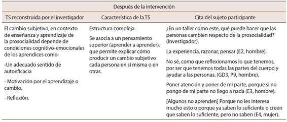 Posterior a la intervención, lo que fundamentalmente cambia es el desarrollo de una TS de mayor complejidad, que considera el efecto de la educación formal en el desarrollo de este comportamiento e incorpora conocimiento procedimental sobre cómo se enseña y aprende este tipo de comportamiento, en contextos de educación formal. Es decir, que al beneficiarse el estudiantado de una instancia de taller, esta experiencia le permite adquirir la capacidad de enjuiciar este espacio de trabajo y desde esto, sugerir herramientas, procedimientos y actividades concretas que podrían favorecer un mayor cambio en el comportamiento prosocial. Para estos grupos de estudiantes, las metodologías de enseñanza centradas en sus intereses y necesidades; y el trabajo grupal, práctico, aplicado y centrado en la reflexión son indicados para enseñar y aprender la prosocialidad en contextos educativos formales. La Tabla 4muestra este proceso de cambio.