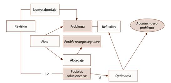 *El estudiantado aborda la recarga cognitiva de modo controlado ante las distintas posibilidades de solución de un problema (n). Si logra realizarlas, desarrollarlas, entonces se está provocando Flow mediante el desafío que le propone su docente en dicho abordaje del problema, este apoyo de control óptimo de la situación permite que el grupo de estudiantes se independice paulatinamente mediante distintos procesos reflexivos que despiertan el optimismo para abordar tareas complejas posteriores. Nota: Elaboración propia.
