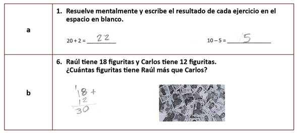 La falta de fluidez en la operatividad de procesos matemáticos básicos aletarga otros de mayor dificultad en el estudiantado, y en los cuales la ansiedad es un distractor emergente en el rendimiento (Csikszentmihalyi, 1998a; 1998b; Nakamura, 1998). Antes de iniciar el programa experimental, el estudiantado desarrollaba las tareas básicas con errores en la redacción de dígitos. Por ejemplo, al buscar completar 20 + 2 =… lo hacían completando 20 + 2 = 2... En cambio, al finalizar el programa (evaluación postest), los aciertos evidenciaron la obtención de mayor determinación y confianza en el desarrollo de este tipo de operaciones (Figura 4, imagen a).