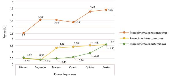 Las tareas procedimentales no conectivas (NC) presentaron mejoras significativas luego que se desarrolló el programa Andamiaje profesorado-alumnado durante los seis meses de aplicación con cambios significativos desde el quinto mes, desde el cual se desarrolló la autodeterminación y autoeficacia, las cuales permitieron que los sujetos analizaran estructuras semánticas complejas para el desarrollo de la tarea compleja.