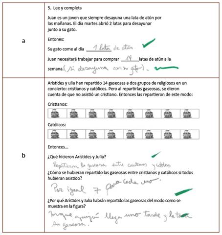 Figura 6: Ejemplificación de tareas conectivas (a) y tareas hacer matemáticas (b) luego de aplicar el programa Andamiaje profesor alumno