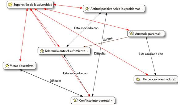 La categoría superación de la adversidad tiene que ver con la capacidad de sobreponerse y superar situaciones de vida que podrían ser negativas para el desarrollo del estudiantado (Figura 1). De acuerdo con los resultados, las situaciones adversas varían según cada realidad familiar; sin embargo, los discursos de las familias tienden a estabilizarse a partir de las siguientes subcategorías: ausencia de la madres o el padre o ambos, uso excesivo de alcohol de algún miembro de la familia, enfermedad física del estudiante y metas educativas. La superación de la adversidad no se logra rápidamente, es un proceso que se vive y como todo proceso tiene aspectos tanto positivos como negativos; en este sentido, los problemas familiares los hacen sufrir frustración y molestias, esto genera peleas y conflictos entre los miembros del grupo familiar. Sin embargo, la superación de dichos problemas implica algo positivo, sobreponerse y comprender que una condición familiar o personal que dificulta el desarrollo académico puede transformarse en la oportunidad de adquirir herramientas para ser más tolerantes al sufrimiento y enfrentar con actitud positiva los problemas educativos que, en términos comparativos, son menos graves que los acontecidos en sus trayectorias de vida.