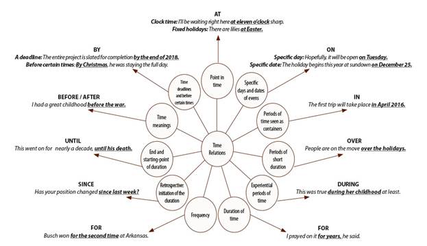 Prepositions, including those expressing location in space, also express ideas related to circumstances of time. Figure 1 summarizes these cases.