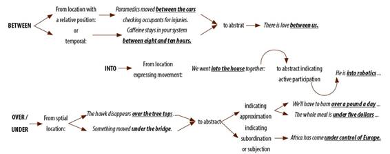 Figure 2: Metaphorical and abstract uses of between, into, over/under