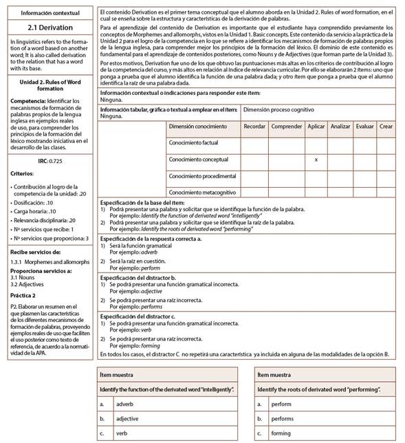 Por otra parte, el desarrollo de especificaciones de ítems es un proceso formal que describe al responsable quien finalmente elaborará el ítem, las características que debe tener la tarea evaluativa. En otras palabras, se habla de un retrato por escrito de un ítem, este retrato detalla las características que deben tener los reactivos y las respuestas a estos, de manera que pueda considerarse válida la tarea evaluativa. Un ejemplo de una especificación de ítem es la mostrada en la Figura 1.