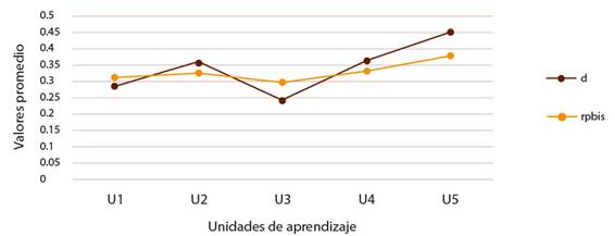 En la Figura 2 anterior se observa que todas las unidades tuvieron valores buenos en promedio, tanto para el índice de discriminación como para el coeficiente de discriminación. En el caso específico de la unidad dos, el rango de valores en los que se ubicaron los índices de discriminación fueron de .17 y .72, por su parte el rango obtenido para el coeficiente de discriminación (Rpbis) fueron de .14 y .5. En general la unidad 2, que es la más importante para la asignatura, obtuvo un coeficiente de discriminación promedio de .32 y un índice de discriminación promedio de .35. Lo anterior significa que en cuanto a poder discriminatorio los ítems desarrollados para esta unidad cumplen satisfactoriamente con los estándares de calidad.