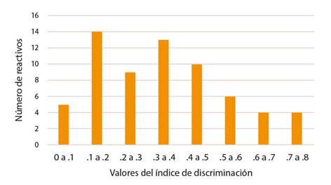 En cuanto a los índices de discriminación se puede observar la distribución de los 63 ítems de la prueba en la Figura 3, que si bien se identifica un número alto de valores en el rango de .1 a .2 (14), solo seis de ellos se encuentran por debajo de .19, lo que significa que tienen un margen de mejora positivo.