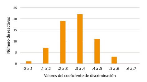 Por su parte, las distribuciones de los valores del coeficiente de discriminación en los 63 ítems se muestran en la Figura 4.