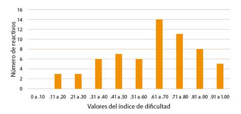 En relación con el índice de dificultad, la distribución de la dificultad de cada uno de los ítems se muestra en la Figura 5, en la cual se puede notar como el mayor porcentaje de ítems se encuentra en el rango de dificultad de .61 a .70. Por esta razón el promedio de dificultad del examen se ubica en .647; como se mencionó anteriormente, esto significa que el examen tiene una leve tendencia a ser más fácil que difícil.