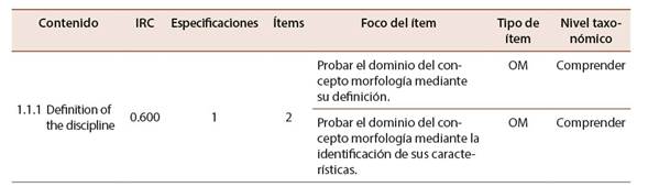 En la Tabla 1 se ejemplifica para solo un contenido temático de todo el universo de conocimientos que comprende la asignatura una serie de atributos y características que permiten valorar e integrar el mismo en el diseño de la prueba. Por ejemplo, se detalla el índice de relevancia curricular (IRC), cuantos ítems para ese contenido deben producirse, cuál es el foco u objetivo que se busca alcanzar con ese ítem, qué tipo de ítem es (para este ejemplo OM se refiere a opción múltiple) y el nivel taxonómico que el ítem comprende, es decir, la dimensión del nivel cognitivo que el ítem implica.