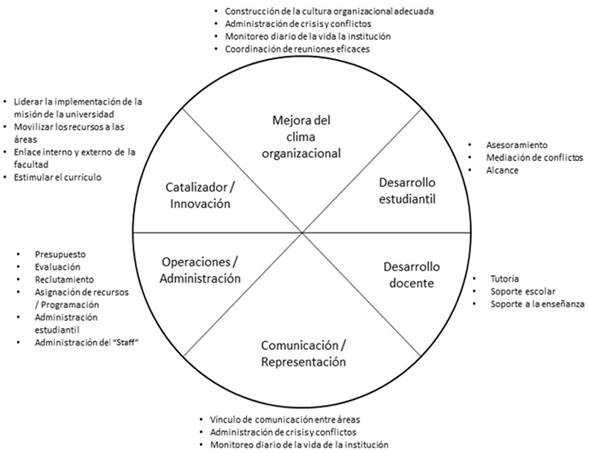 Como se puede observar en la figura 1, el rol de un directivo educativo no es fácil, tiene que cumplir diversas actividades que, por su complejidad, requieren de habilidades especiales o competencias. Se debe ser un líder que abarque diversas funciones y tareas administrativas (operaciones/administración), esté en contacto con diferentes actores sociales (comunicación/representación), lleve a alcanzar niveles de excelencia en el ámbito académico (desarrollo docente y estudiantil), busque las mejores prácticas académicas y organizacionales (catalizador/innovador) y conduzca a toda la organización a mejores niveles de desempeño (mejora del clima organizacional).