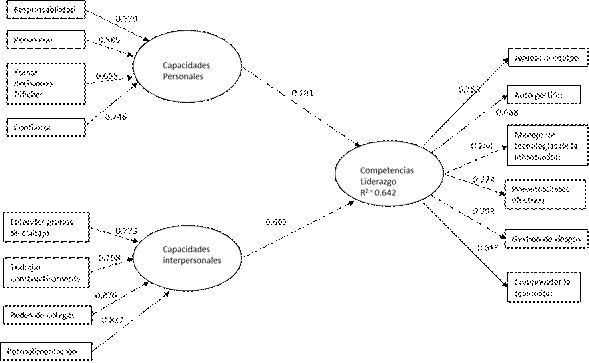 Las variables capacidades interpersonales y capacidades personales contribuyen a explicar de manera significativa la variable competencias del liderazgo como se explicó anteriormente. Sin embargo, la contribución de la variable capacidad interpersonal es mayor estadísticamente hablando que la de la variable capacidad personal en la explicación general del modelo. Es decir, de acuerdo a los resultados, es importante considerar en un administrador-educativo el fomento de las habilidades interpersonales y en un segundo plano las habilidades personales. El modelo resultante difiere del modelo propuesto por Scott et al. (2008) debido a que no todas las características personales e interpersonales contribuyen a explicar la competencia del liderazgo. Es preciso entender que el ámbito del estudio fueron universidades mexicanas y esto posiblemente haga una diferencia con respecto al modelo propuesto por estos autores para las universidades australianas.