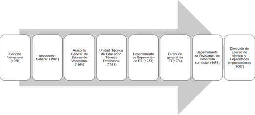 Figura 1 Transformación en nomenclatura y funciones de la Educación Técnica en el Ministerio de Educación Pública 1956-2007