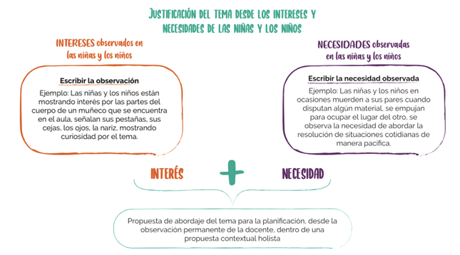Este instrumento rescata el rol protagónico de las niñas y niños, pues a partir de sus intereses y necesidades se realiza la planificación docente. En este sentido, es fundamental la observación de los procesos de las niñas y los niños para aprovechar el interés hacia algún tema, así como también el abordar situaciones que lo requieran. Es necesario recordar que los intereses y necesidades de los pequeños también están mediados por las experiencias, oportunidades y tono emocional de las personas mayores y de otros aprendices.