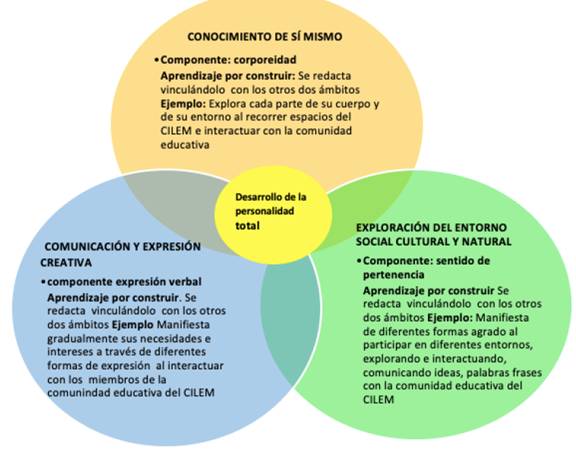 En la Guía pedagógica para niños y niñas desde el nacimiento y hasta los 4 años del MEP, los ámbitos de aprendizaje se presentan de manera separada, aunque en la fundamentación teórica se señala que los ámbitos se interrelacionan. En este sentido, en la elaboración de esta propuesta se decidió establecer la interrelación que se da entre los diferentes ámbitos, tanto en su representación gráfica como en su implementación.