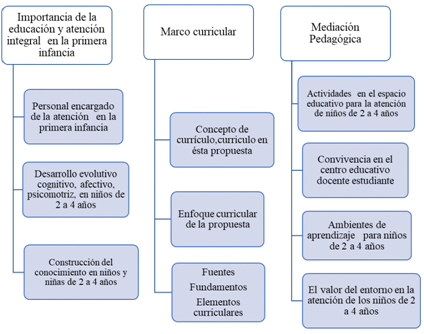 Al tratarse de una propuesta curricular para orientar la mediación del personal docente que atiende niñas y niños de 2 a 4 años, a partir de lo propuesto en la Guía pedagógica para niñas y niños desde el nacimiento y hasta los 4 años propuesta por el MEP, se contempló, previamente en el estudio, aspectos que permitieran sustentar la información que se recopilara. En este sentido, se plantearon los siguientes temas: