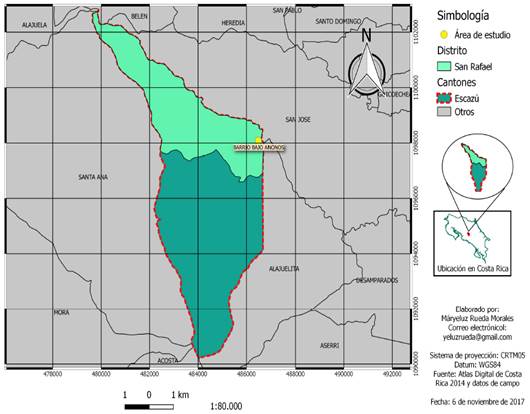 Figura 1. Fuente: Ubicación geográfica del área de estudio. Elaboración propia con datos del Atlas Digital de Costa Rica 2014 y datos de campo.