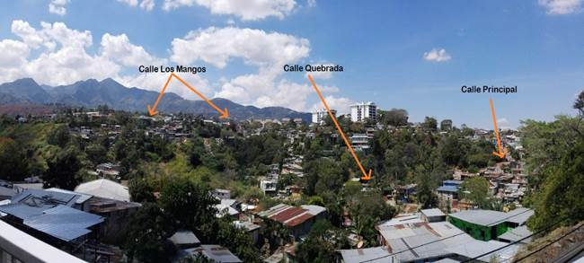 El asentamiento informal Bajo Los Anonos, según la división administrativa de Costa Rica, se ubica en el distrito de San Rafael, cantón de Escazú, provincia de San José (figura 1). Según datos proporcionados por el Instituto Nacional de Estadística y Censos, para el 2011, en la comunidad habitaban 546 personas, en un total de 216 viviendas (Instituto Nacional de Estadística y Censos [INEC], 2011a). Como menciona Madrigal (2015), esta comunidad no inició como un asentamiento informal; hay personas con más de 60 años de vivir ahí. En la década de los 40 la comunidad tenía una calle muy transitada, la cual unía dos distritos mediante el conocido “Puente Los Anonos”. Cuando el puente colapsó hace 20 años, se construyó uno nuevo en la parte superior de la comunidad. Este hecho hizo que el tráfico disminuyera notablemente, permitiendo a diversas familias asentarse de manera ilegal en las márgenes del río. Las viviendas ubicadas a lo largo de Calle Bajo Anonos, o también Calle Principal (grupo de viviendas a la derecha de la figura 2), tienen título de propiedad, mientras que las ubicadas en Calle Los Mangos y Calle Quebrada no los poseen.